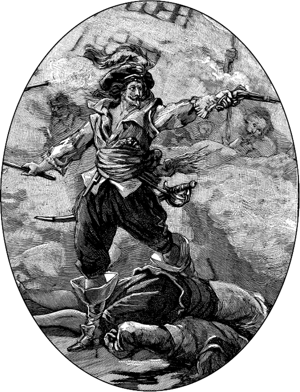 Лет вошедшему на вид было двадцать пять. Длинные черные волосы в беспорядке падали на его плечи, черты его благородного лица свидетельствовали об уме, а в черных глазах читались мужество, пылкость и привычка повелевать. Вся физиономия незнакомца носила отпечаток величия, умеряемого, впрочем, доброжелательной улыбкой большого рта с красиво очерченными, яркими губами, обнажавшими ослепительно-белые зубы. Верхнюю губу украшали по моде того времени изящно завитые усы, а под бородой угадывался квадратный подбородок, говорящий об упрямом нраве.