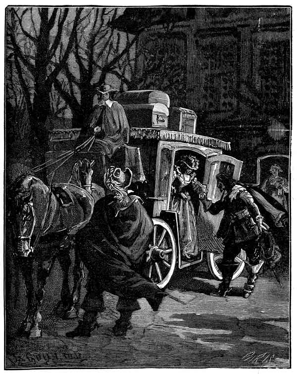 Как только по его приказанию конюх отодвинул засов и отворил ворота, несколько всадников въехали на двор. За ними следовала карета, запряженная четверкой лошадей. При свете фонаря, который держал слуга, трактирщик увидел, что путешественников семеро: трое господ, трое слуг и кучер на козлах. Все были закутаны в толстые плащи и вооружены.