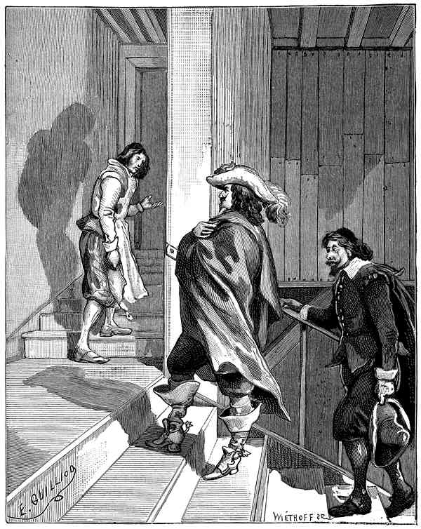 Пока трактирщик принимал путешественников, незнакомец углубился в сад. Дойдя до калитки, он тихо свистнул. Тотчас появились два человека. У каждого была длинная рапира на боку, пистолеты за поясом и карабин в руке.