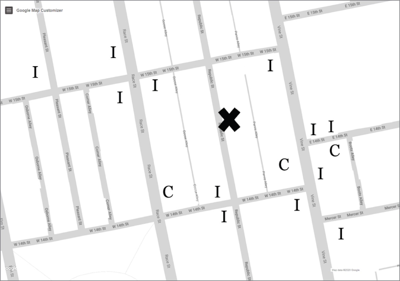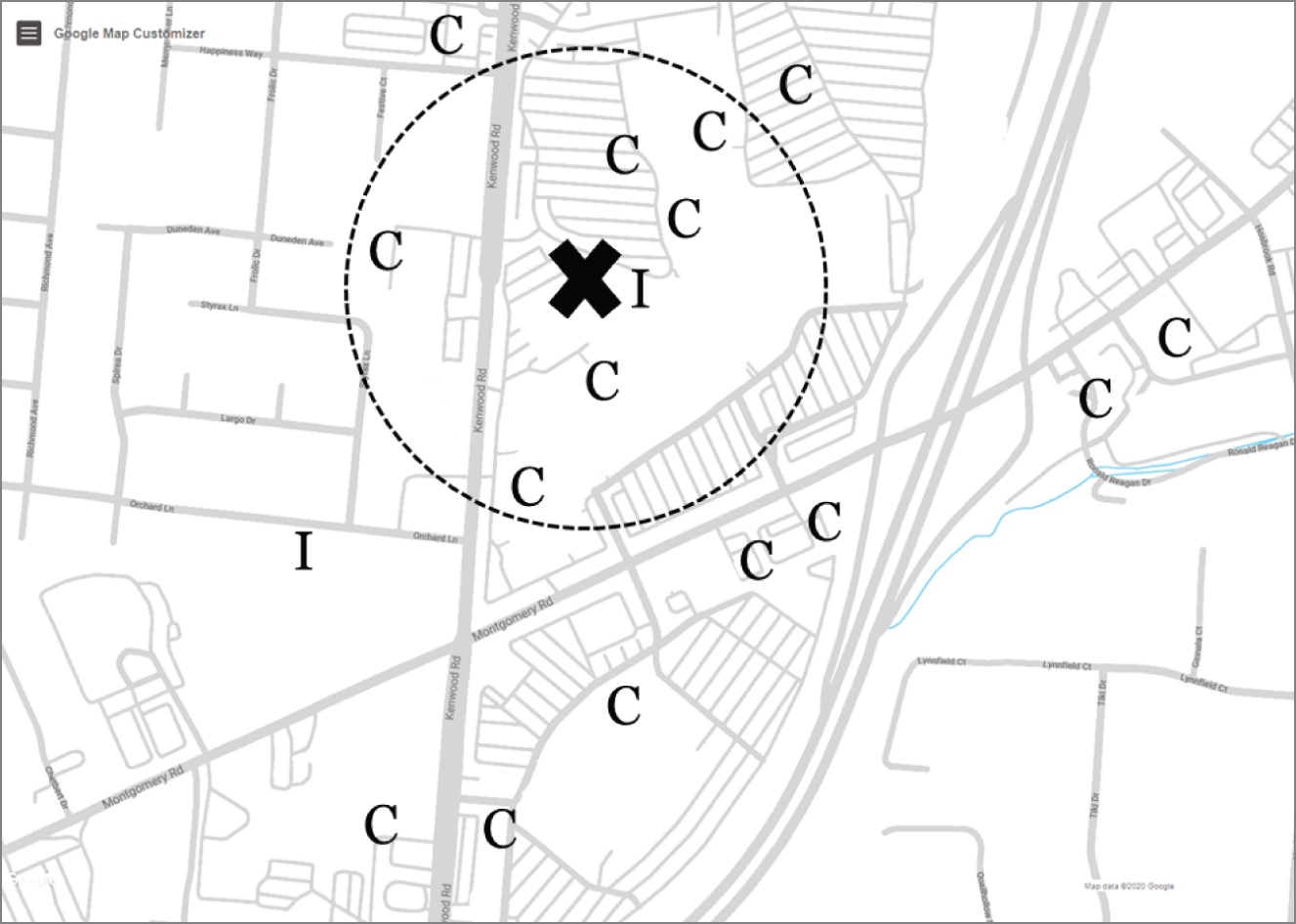 Now look at the data in the first image on the next page. The new restaurant is marked with an X, the Cs indicate chain restaurants, and the Is indicate independent, local eateries. What would you guess this time?