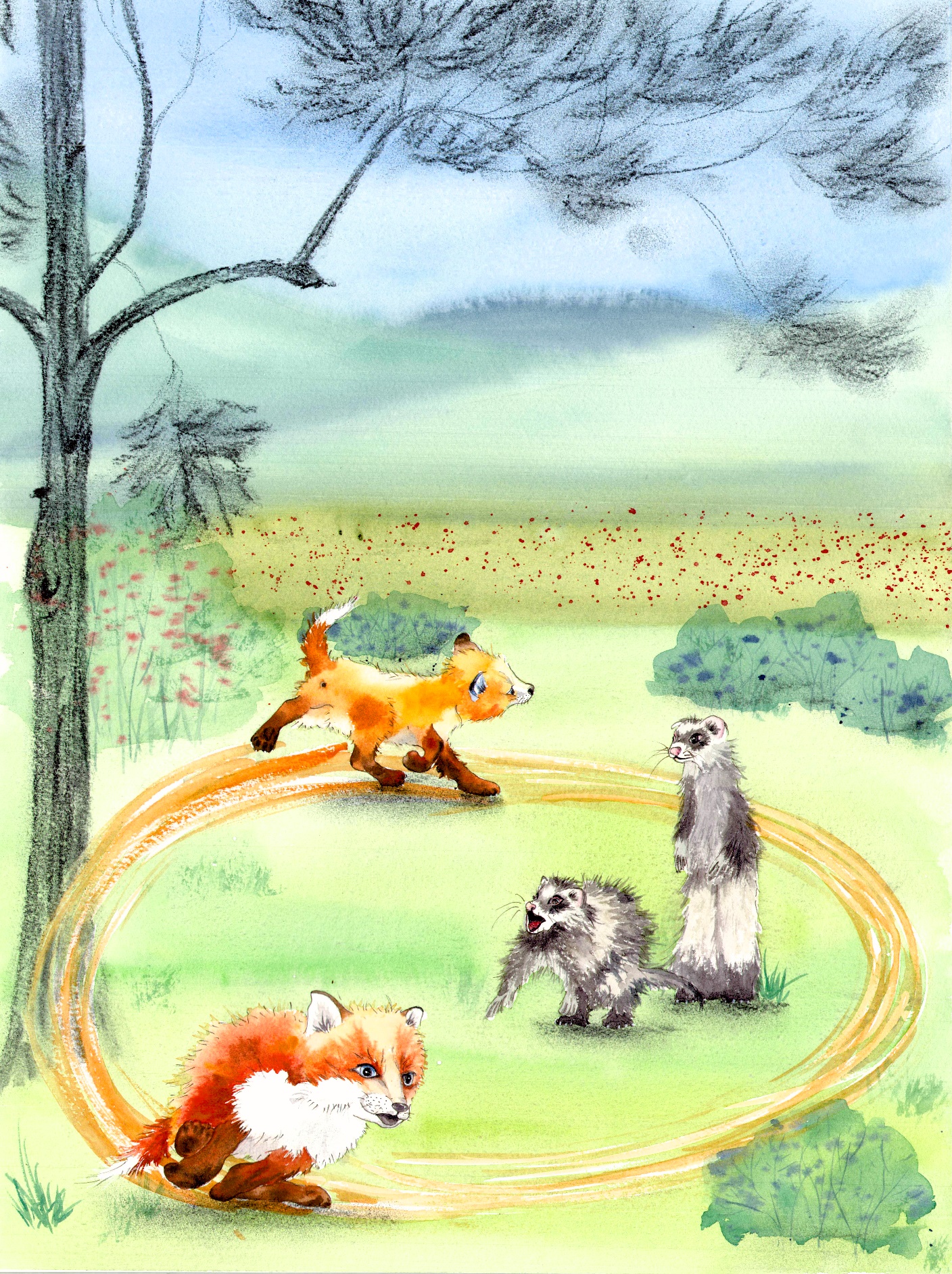 Хорьки сидели, прижавшись к друг другу и ошарашенно смотрели, как вокруг них носится мой Брат. Он бегал так быстро, что казалось, будто Хорьки сидят внутри рыжего размытого кольца. Они крутили головами, стараясь следить за Братом. Я подумал, что так у них скоро совсем головы налево открутятся. И тогда, на всякий случай, побежал вокруг них в другую сторону. Только вот я не знал, что им крикнуть обидного.