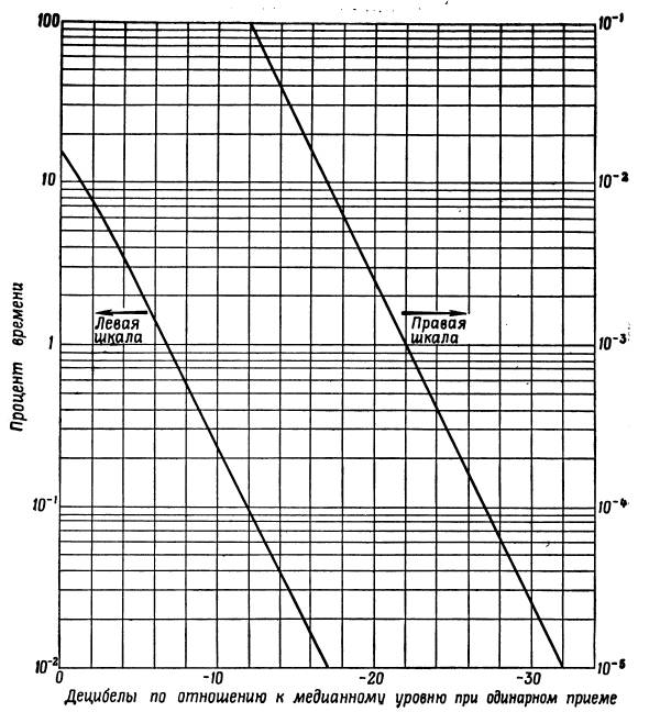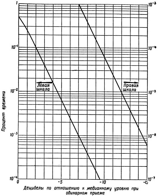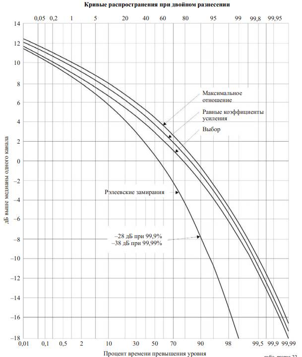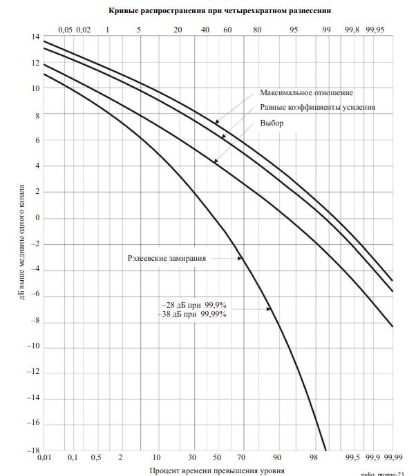 За нуль децибел на графиках принято медианное значение сигнала при одинарном приеме. Под процентом времени здесь понимается величина ɤ=2×Рош×100%, где Рош – заданная вероятность битовой ошибки.