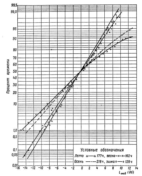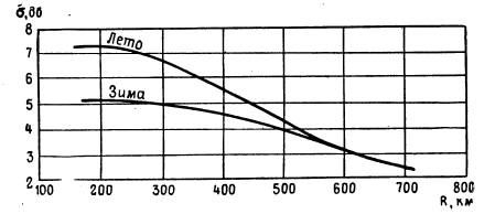 В случае необходимости определения Lмед для других длин волн можно приближенно считать, что значения Lмед обратно пропорциональны длине волны. Если потребуется оценить потери для летнего или другого времени года, то следует учесть сезонный ход потерь, который можно в среднем принять равным 12 дБ. Таким образом, для летних месяцев нужно значения, приведенные на рис. 1, уменьшить на 12 дБ, а в осенние и весенние месяцы – на 6 дБ.