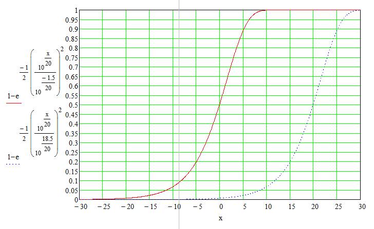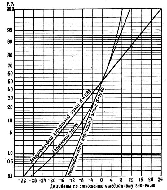 Для расчетов на ПЭВМ нужно получить формулы, по которым строятся графики для логарифмически нормального закона распределения, приведенные на рис. 7, причем для любых значений σ. Обратим внимание на то, что для этих графиков, отклонениям от медианного значения на величину σ (5 дБ и 10 дБ соответственно) соответствует % времени, равный 84%, то есть вероятность 0.84.