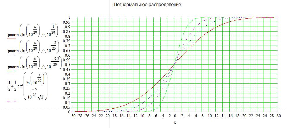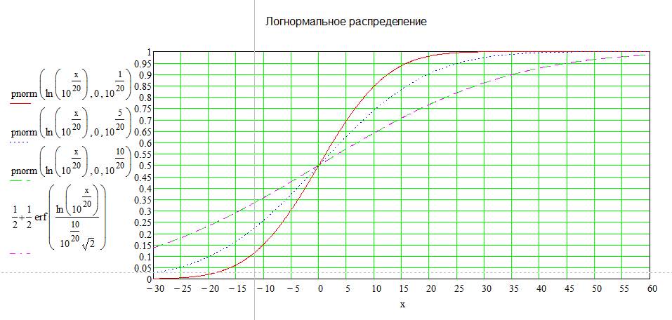 Примечание: Построение графиков выполнено в программе Matcad, слева от графиков показаны расчетные формулы. Для примера показаны два типа расчетных формул (через функцию pnorm и функцию erf), дающих одинаковый результат.
