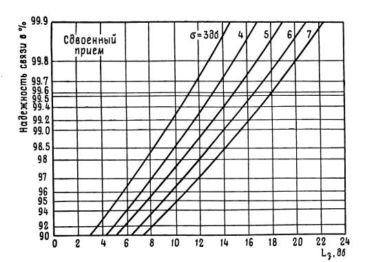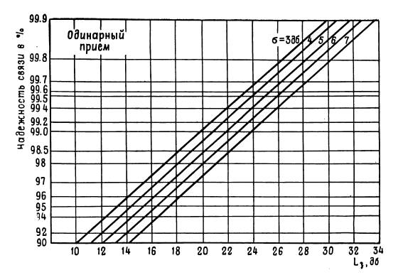 Для того чтобы найти величину Lз, соответствующую определенной надежности связи при работе в телефонном режиме за продолжительный период (месяц), нужно найти функцию результирующего распределения уровня сигнала, учитывающую как быстрые, так и медленные замирания. Она будет зависеть от величины стандартного отклонения логарифмически нормального распределения σ для данной протяженности радиолинии и данного сезона года, а также от кратности разнесения.