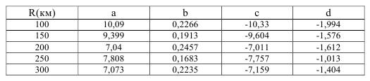 где a, b, c, d – коэффициенты, зависящие от дальности связи R, приведены в таблице 3.