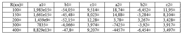 a1, b1, c1, a2, b2, c2 – коэффициенты, зависящие от дальности связи R, приведены в таблице 4.