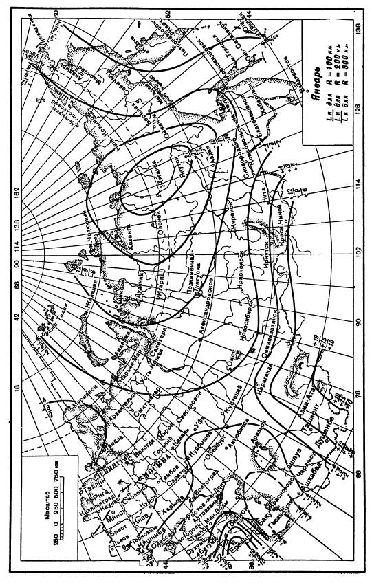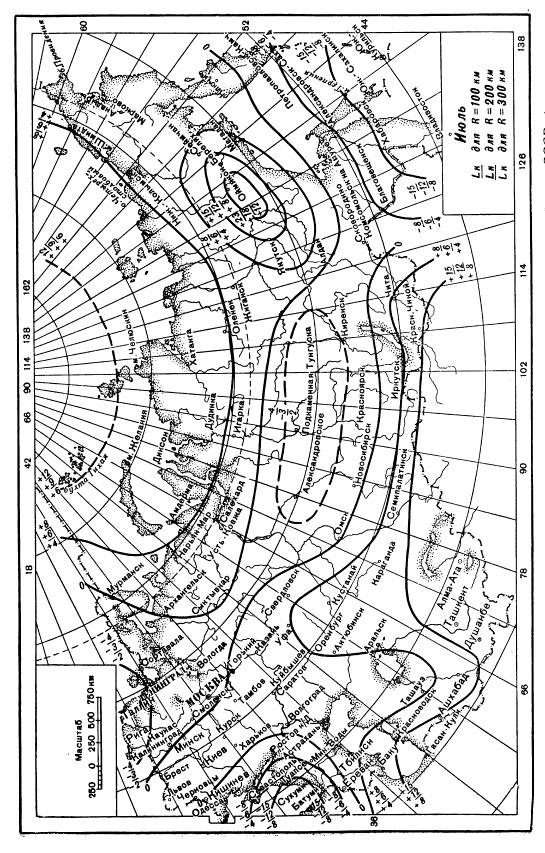 По данным многолетних измерений метеорологических элементов, проводившихся на территории СССР, были рассчитаны значения Nз и вычислены величины Lк. На рис. 14 и 15 показаны изолинии изменения величины потерь Lк на территории СССР. Значения Lк даны на картах для трасс длиной 100, 200 и 300 км.