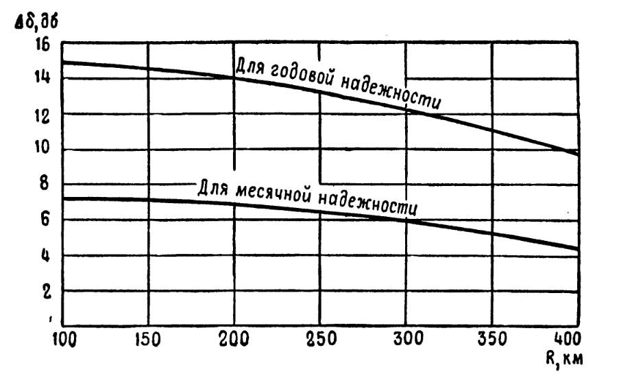 Рис. 16. Зависимость дополнительного запаса высокочастотного уровня сигнала от расстояния при переходе от суточной надежности к месячной или годовой надежности