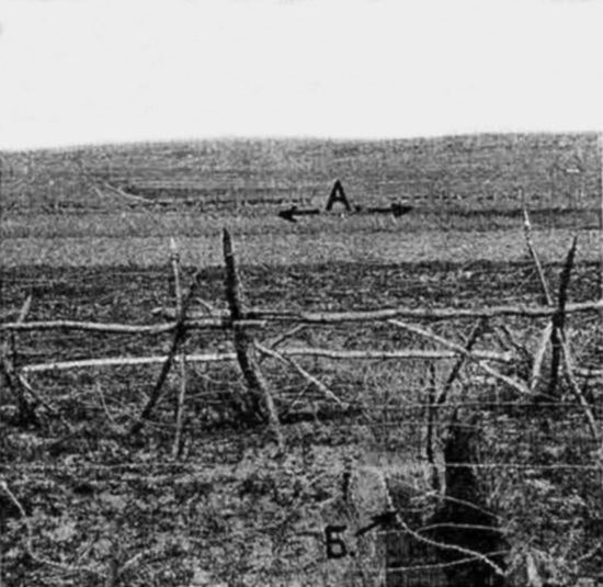 Рис. 1. А – русский окоп, с ясно видимыми даже на фотографии, бойницами, которые – со дна рва Б проектировались на фоне неба. Б – проход из-под бруствера австрийского окопа в сторожевой (снайперовский) ровик. Снято с бруствера австрийского окопа.