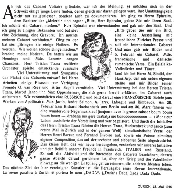 «Кабаре Вольтер. Под этим названием сгруппировалось общество молодых художников и литераторов, цель которых – создать центр для развлечения художников. Принцип кабаре выбран потому, что во время ежедневных встреч происходят музыкальные и декламационные выступления деятелей искусства, пришедших сюда в качестве посетителей, приглашается сюда и более молодая художественная поросль Цюриха с тем, чтобы тоже проявляли себя со своими предложениями и произведениями без всякой оглядки на какое-то особое направление».