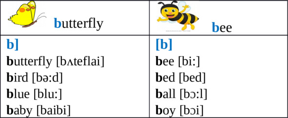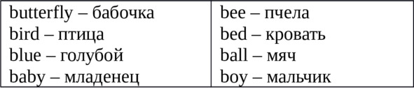 Vocabulary:sing – петьanimal fair – ярмарка животныхbird – птицаbeast – звериbaboon – бабуинmoon – лунаcomb – расчесыватьbunk – койкаslide – скользитьtrunk – хоботsneeze – чихатьknees – колениmonkey – обезьянаProverb:1.actions speak louder than words;(хорошие дела лучше хороших слов);2.all is not gold that glitters;(не все то золото что блестит).Bb [bi: ]