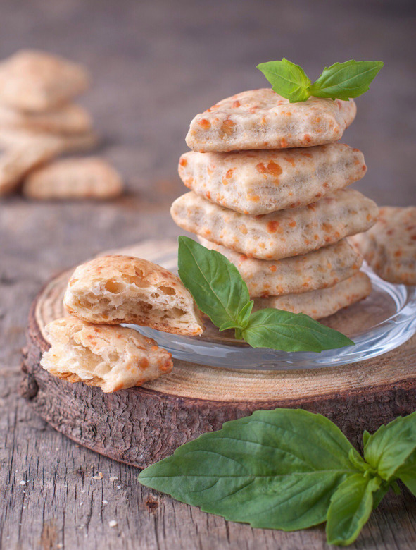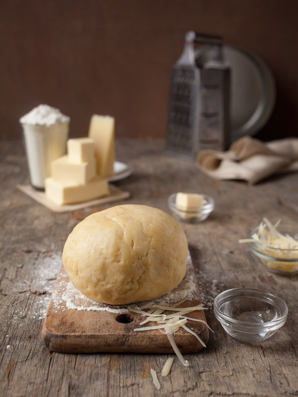 1. Муку всыпать в чашу блендера (или миску). Туда же добавить натертый сыр и нарезанное крупными кусками масло. Включить блендер и обрабатывать массу, пока все ингредиенты равномерно перемешаются. Влить воду и снова включить блендер, пока масса не станет однородной и соберется в шар. При ручном замешивании сделайте то же самое руками. Не делайте это долго, чтобы масло не растаяло от тепла ваших рук, а просто равномерно распределилось по муке.