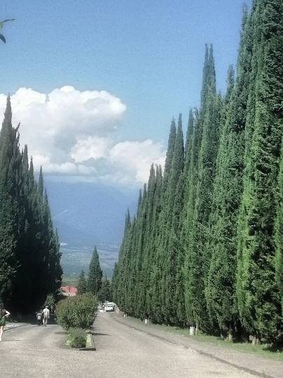 Усадьбу Чавчавадзе видно с трассы. Заезжаем по длинной очень красивой аллее из кипарисов, и нам в перспективе открывается сам дом семьи и прекрасно устроенный парк.