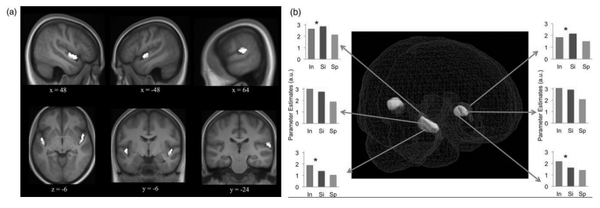 Embodied learning (обучение, основанное на вовлечении тела) исходит из положения, что ум и тело в процессе обучения неразделимы. Для вокального искусства этот подход особенно плодотворен, ведь пение – по своей природе телесный навык. Звукообразование зависит от дыхательной мускулатуры, работы гортани, положения рта, резонансов в полостях – то есть от физических действий. Многочисленные нейрофизиологические данные подтверждают: во время пения в мозге активируются сенсорные, моторные и мультисенсорные области, связанные с движением и ощущением. В прошлом fMRI-исследовании было визуализировано, что активность при пении распределяется по множеству кластеров мозга, задействуя связки «восприятие–действие» сильнее, чем при одном лишь прослушивании музыки (рис. 1) [6]. Иными словами, голос – это не только звучащий инструмент, но и ощущаемое тело. Поэтому обучение пению через физические аналоги (жесты, движения) соответствует природной сущности вокала.
