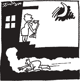 Как изображают хитрость на рисунке? Супруга ждет поздно ночью своего мужа с веником в руке. Вероятно, она хочет устроить ему головомойку. Не ожидая подвоха, она смотрит на дорогу, по которой супруг обычно возвращается домой. Однако супруг уже давно нашел тайный ход, который позволяет ему прийти домой другим, необычным путем и тем самым остаться незамеченным супругой.