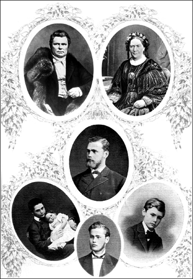 Figure 2. The Nobel Family. Immanuel Nobel (top left), Andriette Nobel (top right), and the Nobel brothers: Robert, Alfred, Ludvig, and baby Emil (bottom, clockwise from top).