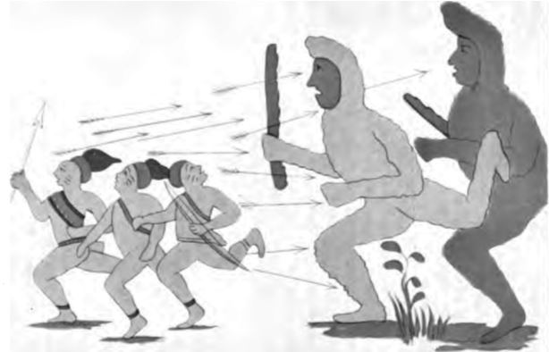 Büyük Tavşan’ın yaptıkları arasında, Algonkin halk masallarında yaşayan devler, yamyamlar ve cadılarla yapılan birçok mücadele vardır. Büyük Tavşan, bir düzenbaz ve kurnazlık ustası olduğu kadar sağlam bir savaşçı olarak da hünerli güçler sergiler. Çakmaktaşı ile çatışma, İrokua geleneğinde olduğu gibi, Ateş Taşı Adamı için hangi maddenin ölümcül olduğuna dair zor bir keşif üzerine döner. Çakmaktaşı, Tavşan’a kendisine neyin zarar verebileceğini sorar. Tavşan; kedi kuyruğu, kuş tüyü veya buna benzer bir şeyin ona zarar verebileceğini söyler ve aynı soruyu Çakmaktaşı’na sorar. O da dürüstçe “geyik boynuzu” diye cevap verir.” Tavşanın onun vücudunu kırıp pullarını döktüğü işte bu geyik boynuzudur. Bu anlatının, boynuzdan yapılmış bir aletin yardımıyla çakmaktaşıyla pul pul dökme eylemine dair kadim icraatın efsanevi bir anısı olduğunu varsayabiliriz.