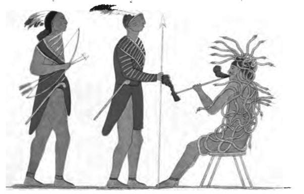 “Oumalar ve Virginia ile Florida’daki bazı halklar da tapınaklara ve neredeyse aynı dini törenlere sahipler. Virginia’dakilerin Oki veya Kousa adını verdikleri, ölüleri izleyen bir putu bile var. Ayrıca tapınaklarını kirleten Fransızların gelişinden beri Oumaların, tapınağın harap olmasına izin verdiklerini ve onu restore etme zahmetine girmediklerini duydum.”