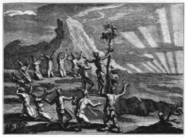 “Louisiana’da Natchezlerin, asla sönmemesi için büyük özen gösterilen daimi ateşin kesintisiz olarak izlendiği bir tapınağı vardır. Üç sivri çubuk onu korumak için yeterlidir, bu sayı asla artmaz veya azalmaz (ki bu bir gizem gibi görünüyor). Yandıkça, başka çubuklarla yenilenmeleri gerekene kadar ateşe yaklaştırılırlar. Bu tapınakta şeflerinin ve ailelerinin naaşları yatar. Şef her gün belirli saatlerde tapınağın girişine gider, burada eğilerek ve kollarını haç şeklinde uzatarak, belirgin hiçbir şey söylemeden kafası karışmış bir şekilde mırıldanır; bu, varlığının yaratıcısı olarak güneşe verdiği görevin simgesidir. Tebaası, onlarla ne zaman konuşsalar, ona ve soyunun tüm prensleri için aynı töreni yerine getirirler ve soyundan geldiklerine inandıkları güneşi bu dışsal saygı işaretiyle onurlandırırlar. Natchezlerin kulübeleri yuvarlakken tapınaklarının uzun olması tuhaftır (Vesta’nınkilerin tam tersi). Çatının iki ucunda iki kartal resmi görülür; kartal, batının tamamında Jüpiter’e, doğulular arasında da güneşe adanmıştır.