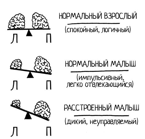 Но мало этого – мозг маленького ребенка приходит в состояние еще большего дисбаланса, когда тот расстроен. Сильные переживания немедленно выключают разумную левую половину и возбуждают импульсивную правую.