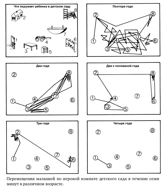 • При этом концентрация внимания у них крайне низкая. Маленькие дети перескакивают от одного к другому. Такая неустойчивость внимания наглядно отображена на схеме, приведенной в книге Луиз Эймс и Фрэнсис Илг «Ваш годовалый малыш» (Your One-Year-Old). Чем старше становится ребенок, тем дольше он способен удерживать свое внимание на чем-то одном.