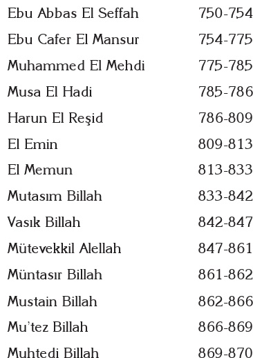 Öte yandan bugünkü anlamıyla tarikat müessesesi de Abbasiler’in son döneminde ortaya çıkmıştır. Bu tarikatlardan başlıcaları Ebu İshak El Kâzerûni’ye nisbetle Kâzerüniyye, Abdülkadir Geylani tarafından kurulan Kadiriyye, Ahmet er-Rufai tarafından kurulan Rifaiyye, Ahmet Yesevi’ye nisbetle Yeseviyye, Ebu Medyen El Mağribi’ye nisbetle Medyeniyye, Necmeddin-i Kübra’ya nisbetle Kübreviyye, Ebu Hafs es-Sühreverdi tarafından kurulan Sühreverdiyye, Muinüddin Hasan Çişti’nin kurduğu Çiştiyye tarikatlarıdır.