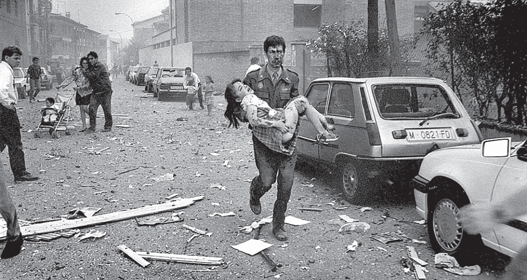 Перед глазами у меня тотчас всплыла фотография, появившаяся в газетах в тот же день. Кажется, это было в Сарагосе. Фотография из тех, которые потом невозможно забыть: на фоне разбросанных повсюду обломков и плывущего зловещего дыма идет гвардеец с окровавленным лицом в форме, из‐под которой виднеется галстук, гвардеец несет на руках девочку лет семи-восьми с раздробленной ногой, и на ее лице отражается только боль, просто боль. От таких черно-белых фотографий нельзя оторвать глаз. Чуть дальше стоит супружеская пара: муж обнимает жену, вцепившуюся в ручки прогулочной коляски, где сидит годовалый, не старше, младенец, но он‐то благодаря этому не запомнит ничего из виденного и слышанного. Чуть в стороне от них застыл мужчина (наверное, отец), закрывающий руками ребенка лет четырех-пяти, с ними рядом – девочка побольше держится вполне уверенно. Но все же в первую очередь мне запомнился молодой гвардеец – или пожарный – с ребенком. И хотя лицо у него залито кровью (его собственной или чужой, покрывающей также руку спасенной им девочки) и она мешает различить черты, взгляд его выражает смесь решимости и глубокого потрясения, возможно, еще и гнева, но прибереженного на будущее, а также – сомнение в реальности происходящего. И решимость спасти изувеченную девочку, хотя на нее он не смотрит, устремив взгляд вперед, судя по всему, на санитарную машину, до которой надо дойти как можно скорее. Глубокое потрясение? Причин для него могло быть много: и то, что он не сумел предупредить эту трагедию, и зрелище невыносимой беды, и ужас, испытанный детьми, которые жили в этих казармах и пока еще мало что понимали, и гибель товарищей. Помнится, чуть позднее ЭТА со страниц своих печатных изданий и устами своих пропагандистов попыталась свалить вину на родителей пострадавших детей (чтобы обелить террористов): если бы гвардейцы не поселились в домах-казармах вместе с семьями, не было бы жертв среди малолетних; это, мол, сами гвардейцы прятались за детьми, как за живым щитом, подвергая их опасности. Террористы прекрасно понимали, что убийство детей вредит их репутации. Но только не в глазах фанатичных сторонников, которые с восторгом встречали любые их акции и требовали новых – ведь позднее всегда можно будет найти им оправдание, и найти без труда. По-настоящему трудно дается лишь первый шаг, а он был сделан еще много веков назад, и каждый следующий шаг – это уже естественное движение вперед, надо лишь передвигать одну ногу за другой и не останавливаться.