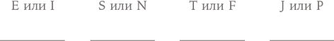 Подсчитайте количество утверждений об экстравертах и интровертах, с которыми вы согласны. Если первых больше, напишите в колонке ниже букву E, если вторых – I. Затем проделайте то же самое с остальными тремя парами предпочтений.