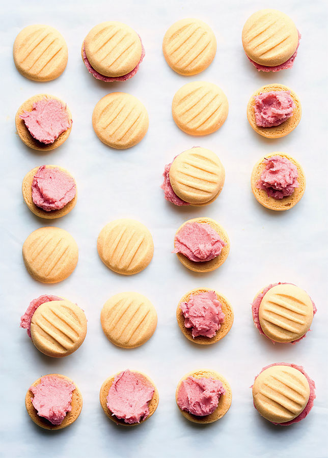 7. Соберите йо-йо: намажьте печенье ревенной начинкой и сложите попарно. Отпечатки вилки должны смотреть наружу. На каждое печенье нужно около 15 г начинки. Вам покажется, что этого многовато, но доверьтесь нам – печенье выдержит.