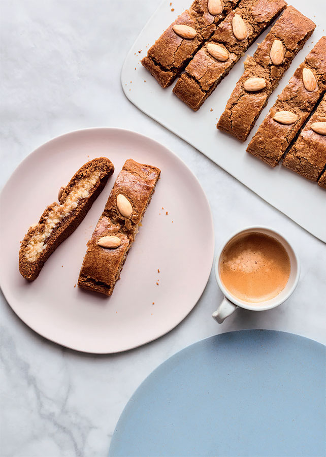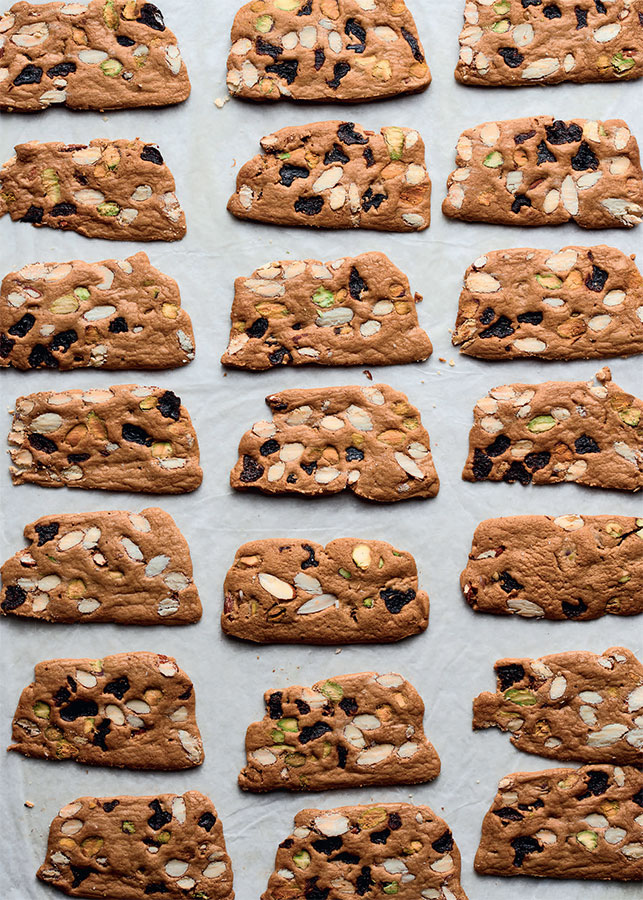 5. Нарежьте «буханку» как можно тоньше, но так, чтобы ломтики не ломались, – в идеале до 2–3 мм – и выложите заготовки на противень с бумагой. При выпекании они не растекаются, так что можете укладывать их вплотную друг к другу.