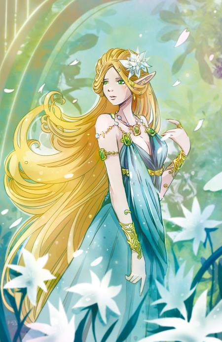 Должно быть, это был центр оранжереи. Все дорожки сходились к огромной клумбе, полной пышных белых цветов. Прямо над ней располагался стеклянный купол. Предзакатный солнечный свет играл на лепестках лилий, и среди них, как в облаках, сидела девушка. Похожая на статую богини, изящная и грациозная. Золотые локоны волос, рассыпанные по обнажённым плечам и сияющие в лучах Орта, фарфоровая полупрозрачная кожа, заострённые удлинённые уши – всё это свидетельствовало о принадлежности к древнему роду элвингов. Слухи о красоте наложницы Орму не врали: она и впрямь была великолепна.