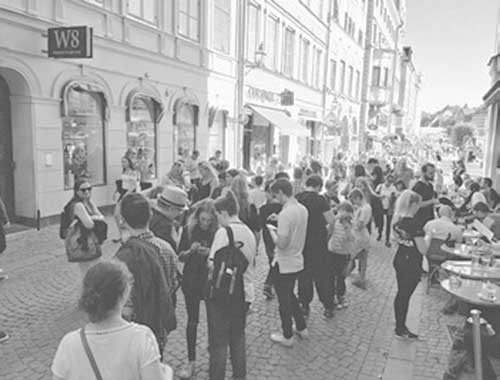 Старый город в Стокгольме vs Pokemon Go. Люди стоят вдоль домов. Фотография сделана за секунду до того как я, спрятавшись за угол, крикнул «Да-а-а! Драгонит!», чтобы увидеть, как двести человек одновременно поймут, что ищут не там