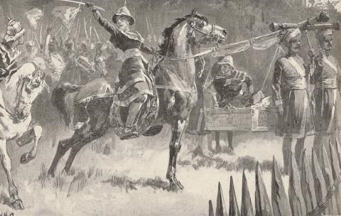 After a two hours' march, the first division came out on open ground by the river side, signalled their arrival to the flotilla, and formed up in front of the stockaded heights of Napadee. The position was an extremely strong one. The enemy occupied three ranges of hills, rising one behind the other, and each commanding the one in front of it. One flank of these hills was protected by the river, the other by the almost impenetrable forest. The hills were all covered with stockades and, as they moved forward, the troops were exposed to so heavy a fire from an enemy entrenched at the edge of the jungle on the right that, before they could advance further, it was necessary to first drive them from this position. Six companies of the 87th were sent back into the forest and, making their way through this, came down in the rear of the stockades, speedily cleared them of their defenders, and compelled the advance force of the enemy to join their main body.