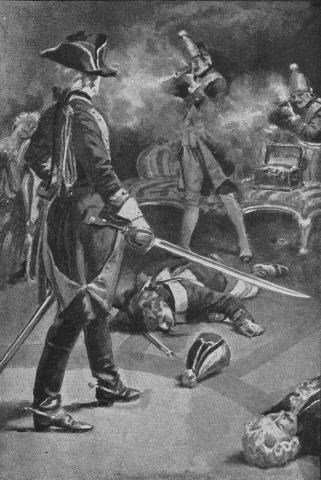 Three soldiers were engaged in examining the contents of a large coffer of jewels. As the door opened they turned round and, on seeing a solitary officer, sprang forward with terrible oaths. Fergus shot one of them as they did so, dropped the pistol, and seized his sword. Both men fired. Fergus felt a stinging sensation in his left arm, and the pistol held in that hand dropped to the ground.