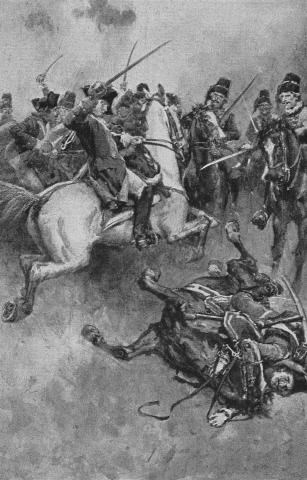 He was drawing abreast of Lobositz, when suddenly a squadron of cavalry dashed out from the village. Their object was evidently to cut him off, and prevent any message that he might bear reaching the Prussian cavalry, which were now halted half a mile ahead. Their officers were endeavouring to reform them from the confusion into which they had fallen, from the speed at which they had ridden and the heavy losses they had sustained.