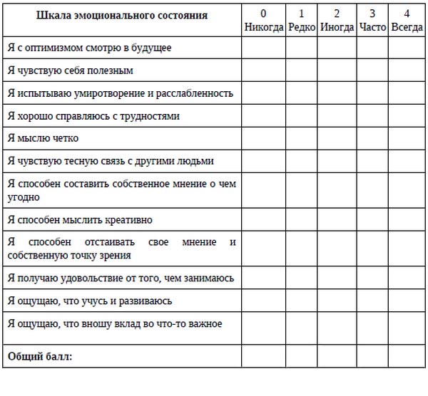 Для оценки текущего эмоционального здоровья воспользуйтесь представленной ниже таблицей. Надеюсь, что и в процессе чтения, и если будете пользоваться инструментами по завершении работы с книгой, общее количество баллов увеличится. Для более полных и достоверных результатов советую возвращаться к данной форме каждые две недели.