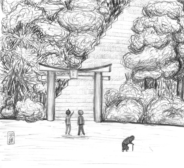 Но мне эта затея всё равно была не по душе. Особенно после того, что он мне рассказал. Казума протянул мне всё необходимое, и пришлось делать то, что он просил. Я с большим нежеланием стал снимать линзы. После я последний раз посмотрел на Казуму с надеждой, что он передумает, но, к сожалению, ожидания не оправдались, и пришлось идти. Я выбрался из кустов, прошёл под тории и стал подниматься по лестнице. Она была довольно длинная, а на пути встретилось ещё двое таких же храмовых ворот, как и первые, стоящие у подножья холма. Вокруг шелестела зелень, и не было ни единого человека.
