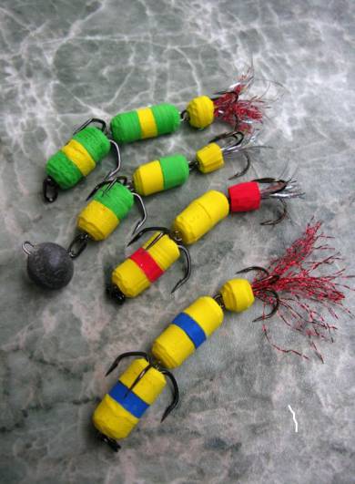 Искусственные приманки: блёсны (в ясную погоду лучше использовать из жёлтой и красной меди, а в пасмурную – белого цвета (серебряные, из нержавеющей стали)), воблеры (объёмные приманки), твистеры (эластичная резина в форме вопросительного знака), мормышки (при движение вверх и вниз слабо покачивается)