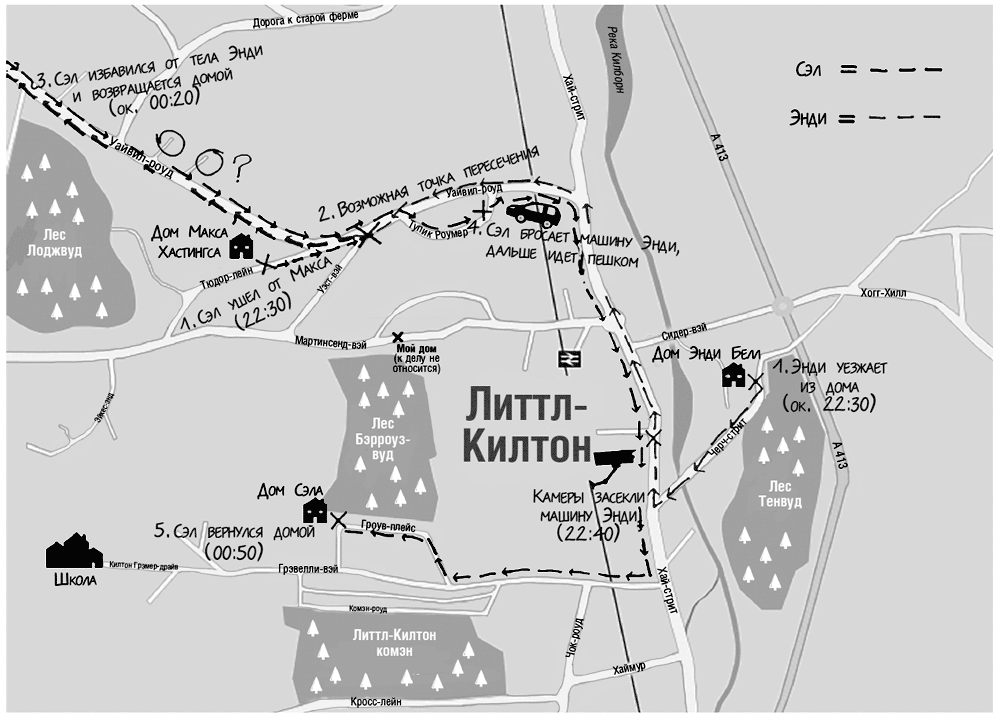 Я не берусь предполагать, куда убийца спрятал тело Энди, потому что у меня (как, впрочем, и у любого другого человека на планете) нет ни малейших оснований для догадок. Учитывая, что от тупика Роумер, где нашли машину, до дома Сэла в Гроув-плейс пешком идти восемнадцать минут, предположительно в окрестностях Уайвил-роуд он оказался в 00:20 ночи. Выходит, если Энди с Сэлом встретились около 22:45, у Сэла был час и тридцать пять минут на то, чтобы убить подругу и спрятать труп. То есть, судя по времени, такой вариант развития событий представляется вполне возможным. Все логично, но тут же в голове возникает миллион вопросов «зачем» и «почему».