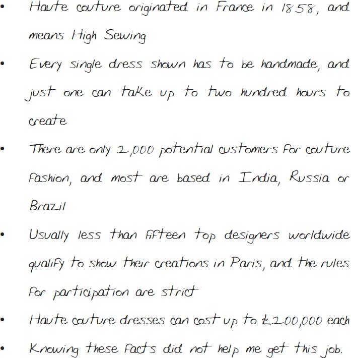 “Are you sure?” I said in dismay. “None of those facts are relevant? Not even the one about how couture seamstresses are called petits mains, which means little hands?”