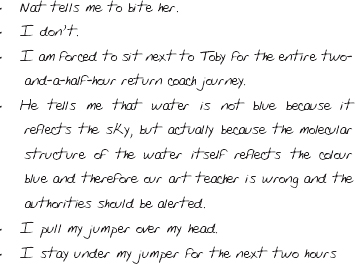 By the time we get back to school I’m so high on my own carbon dioxide and deodorant fumes that my powers of apology have been severely stunted. Before I can even focus my eyes properly Nat has raced off the bus and disappeared, and I’m left to walk home on my own.