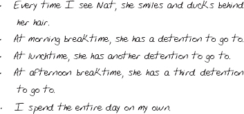By the time the final class comes around and she tells me she’s going to be kept behind after school as well, I’m fairly convinced that Nat is specifically getting detentions just to avoid me. I’m torn between being devastated and simultaneously impressed by her extremely cunning strategic bad behaviour.