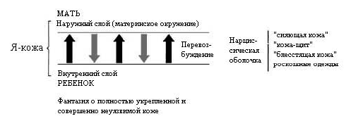 В фантазии об общей с матерью коже, в которой внешний слой блокируется и сообщения от внутреннего слоя поступают в искаженном виде, а всякое желание и попытка человека сепарироваться душит и убивает его, поскольку переживается как сокращение общей кожи, которую невозможно содрать.