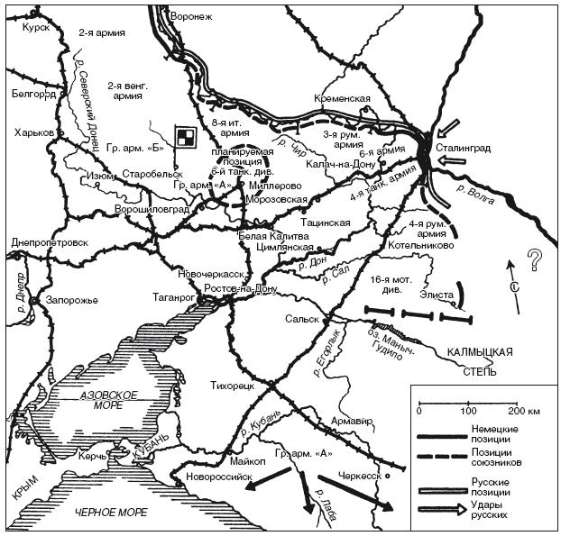 Вторая сильная группировка немецких войск (6-я армия и 4-я танковая армия) находилась к северу, в районе Сталинграда, и вела ожесточенные бои с русскими, которые бросали в бой все новые и новые войска. Между двумя этими группировками в так называемой Калмыцкой степи, под Элистой, находилась почти без командования 4-я румынская армия, которую поддерживала одна надежная немецкая 16-я моторизованная дивизия (протяженность линии фронта составляла 250 км!).