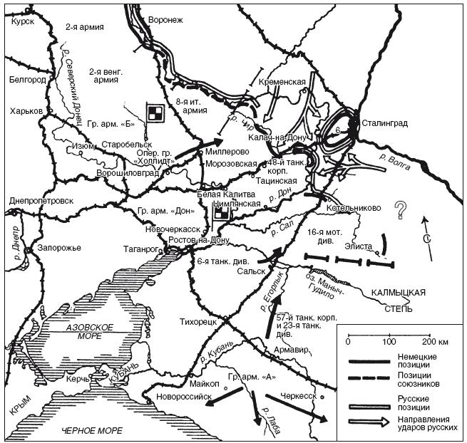 Зато русским их удар на севере, с плацдарма в северной части излучины Дона, принес успех. После прорыва фронта 3-й румынской армии танки русских рванулись на юг и юго-восток (были отражены контрудары 22-й и 14-й танковых дивизий немцев и румынской 1-й танковой дивизии. – Ред.); вскоре они достигли главных путей снабжения и сохранившихся дорог, что позволило им использовать мосты через Дон у города Калач. (Один из мостов немцы успели взорвать, а второй утром 22 ноября был захвачен дерзким ударом передового отряда 14-й мотострелковой бригады [подполковник Г.Н. Филиппов]. Сражаясь в окружении, горстка бойцов удержала мост до вечера, когда сюда с боем прорвались танки 19-й бригады [подполковник Н.М. Филиппенко]. Захват моста и быстрая переправа по нему подошедших 26-го и 4-го танковых корпусов стали решающими в быстром окружении немцев под Сталинградом. – Ред.) Таким образом, русские отрезали воюющие под Сталинградом немецкие войска от баз снабжения. Южная ударная группировка русских, наступавшая со стороны Волги из Калмыцкой степи, прорвала оборону стоявшей там 4-й румынской армии, отрезала ее от идущей с юго-запада (Сальск) железной дороги и сумела после тяжелых боев, прорвав созданную наспех немецкую оборонительную линию, достичь Дона южнее Калача, а там оказать помощь идущим с севера русским войскам.