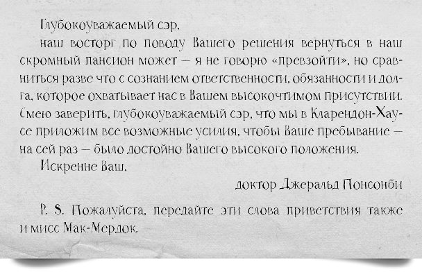 – Ах да. Пожалуйста, откройте и прочтите. Его принесла служанка. Это приветственные слова от доктора Понсонби – то, что, кажется, он не смог мне сказать вчера.