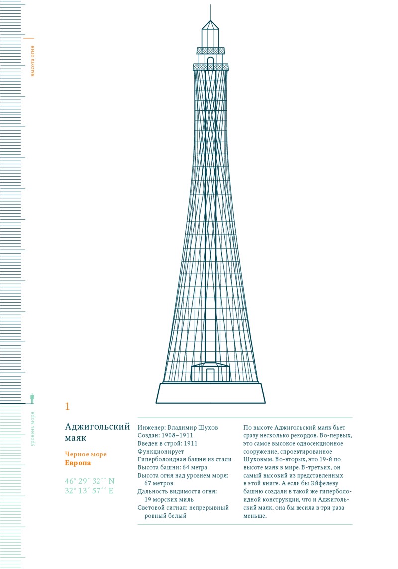 Аджигольский маяк спроектировал Владимир Шухов. Глядя на его чертежи, легко представить, что стоит лишь ветерку подуть в нужном направлении, как вся конструкция тут же рассыплется. Однако постройки на эскизах Шухова чем хрупче выглядят, тем прочнее на самом деле. В конце XIX века он размышлял, насколько устойчивыми будут башни, крыши, павильоны и прочие здания, если для их конструкций использовать как можно меньшее количество материалов. Ему удалось вдохнуть жизнь в простые каркасы из стальной сетки, превратив их в необычную архитектуру, органическую, легковесную, не подчиняющуюся законам времени.