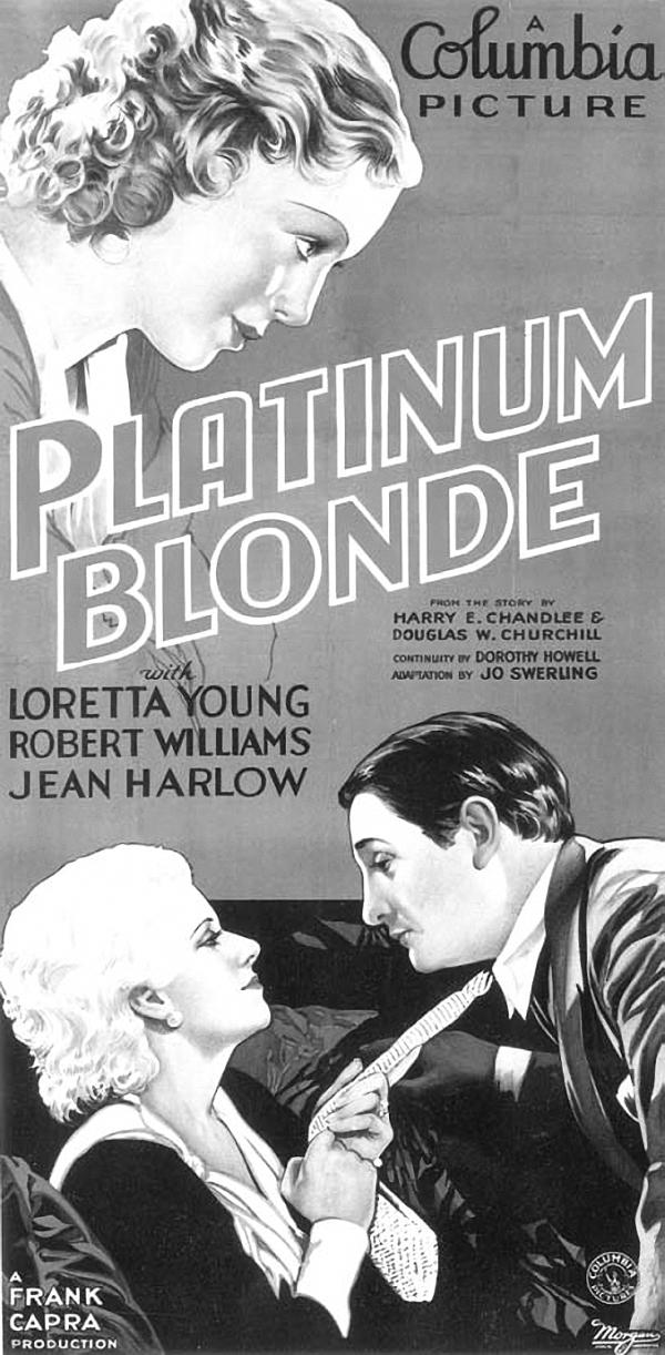 Фильм Фрэнка Капры 1931 г. «Платиновая блондинка» как раз и строился на формировавшейся в ту пору символике этого металла. Название фильма сделалось обиходной фразой. Платиновая блондинка в картине, богатая светская львица, соблазняет репортера, который расследует скандал, связанный с ее семейством, выходит за него замуж и в конце концов полностью подчиняет себе. Главную роль исполняла Джин Харлоу. Первоначально фильм должен был называться «Галлахер» по имени девушки, которая теряет, а затем вновь обретает любовь репортера. Но у продюсера фильма Говарда Хьюза был заключен личный контракт с Джин Харлоу, поэтому он настоял на изменении названия, чтобы придать большую значимость своей протеже. Его идея сработала, выдвинув на первый план Харлоу и породив моду на обесцвеченные волосы.